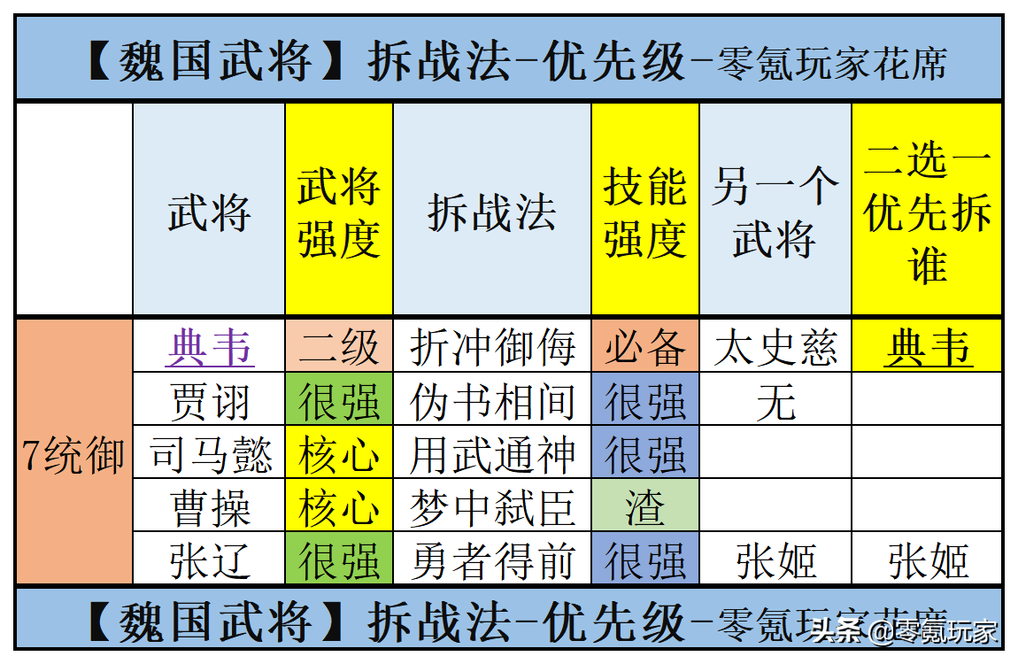 魏国7统御核心卡:司马懿、曹操,张辽如果有专属武器就算核心。