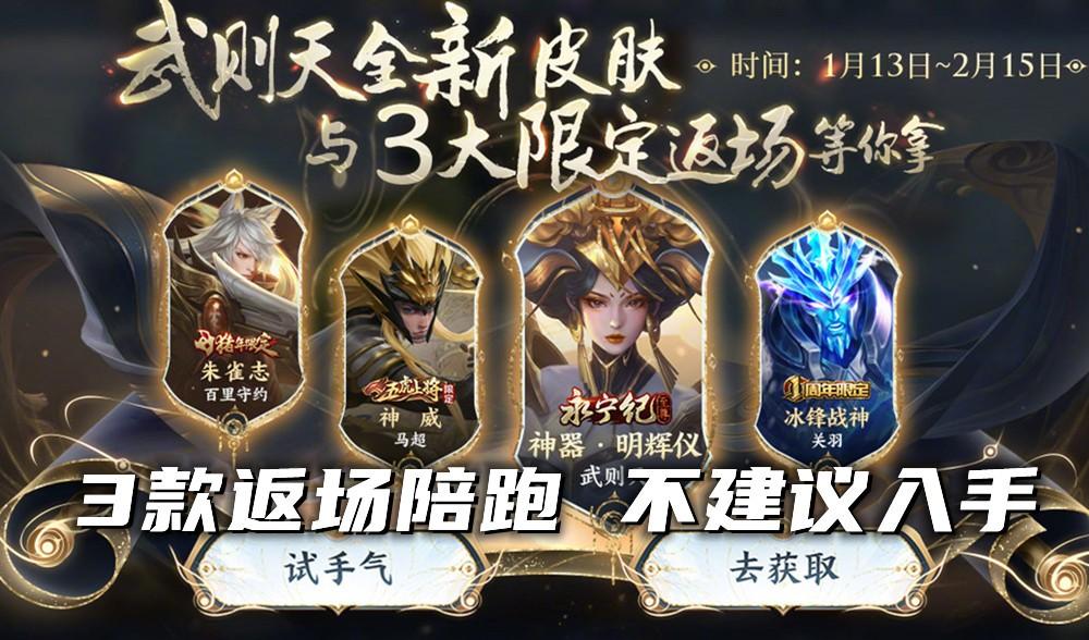 总的来讲,14号会开启点券消费的活动,届时在参与武则天的抽奖会好一些,并且神威、朱雀志、冰封战神并不建议在本次参与返场,这3款皮肤更像是永宁纪的彩头,真打算入手3位英雄的皮肤有其他性价比的选择;而兔年限定的阵容确定3传说+2史诗,套系价格因为有折扣卡,应该会在4500点券的样子,你打算入手吗?