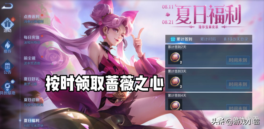 这一种方法是十分轻松,也是十分有效的,因为官方在11号开启的获取蔷薇之心的活动,在此活动中,只要小伙伴们按时间领取蔷薇之心就可以了,不仅如此,小伙伴们还可以参与对局获取。那在此期间内,只要小伙伴们按时间登录,领取的蔷薇之心总共有25个,这25个蔷薇之心也是蛮多的,收集一个25个蔷薇之心,再加上小伙伴们之前获取的,那不是蔷薇之心就满级了嘛!满级之后也就可以圆满的兑换了。