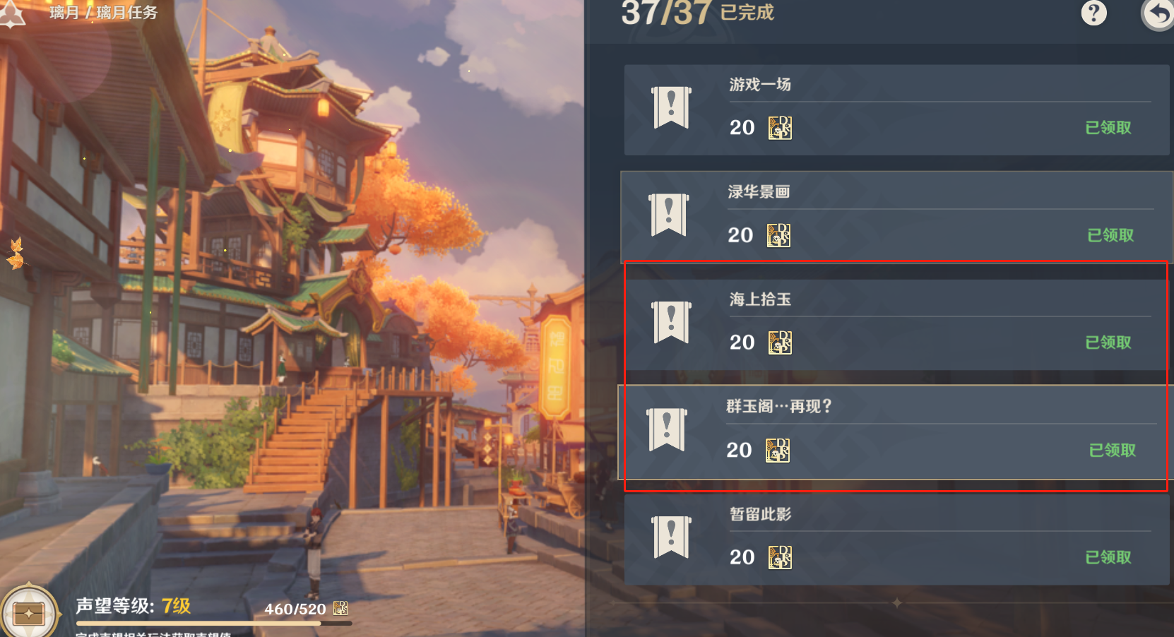 总的来说海上拾玉和群玉阁再现这两个隐藏任务都非常简单,只需要根据任务提示做就可以了,当然了,任务的奖励也一般般吧!不过通过这两个任务,可以确定在不久的将来群玉阁肯定会重新回归到玩家视野中的,到时候玩家就可以好好逛一下群玉阁了(上次都没来得及好好看下群玉阁就炸了),可惜就目前原神的开发进度来说,或许到璃月地图开放了群玉阁才会再次出现吧!
