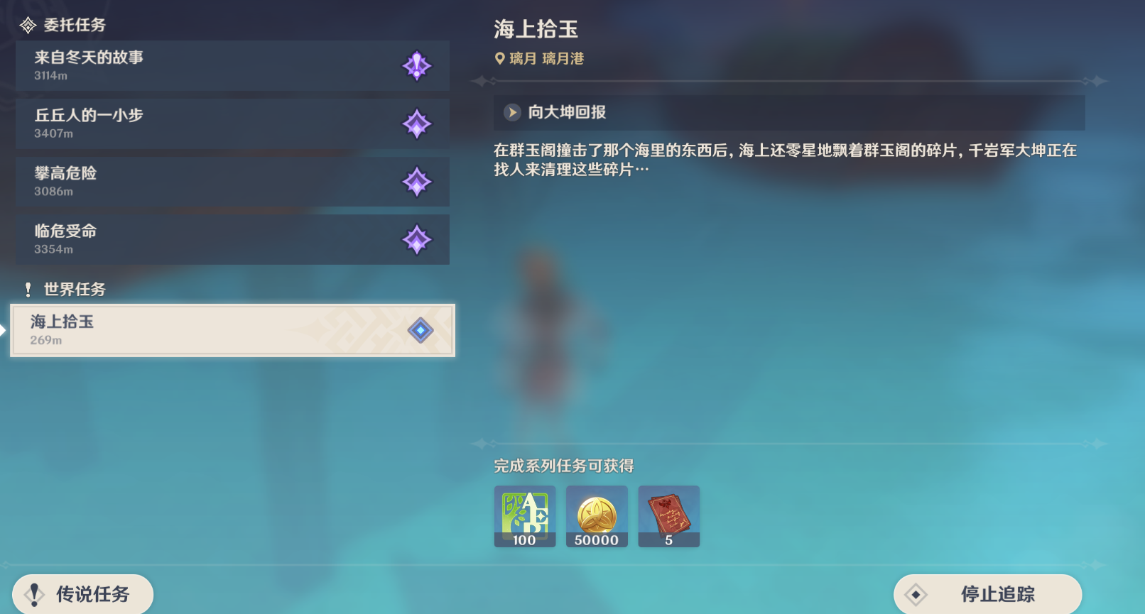 这个任务非常简单,只需要玩家将散落在璃月港海上的群玉阁碎片收集,并找到凝光的秘书百闻就可以了,最终玩家可以白嫖到100点冒险经验,5万摩拉和5本冒险家经验书。