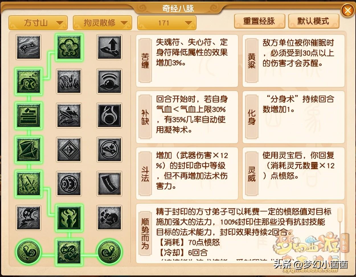 封脉的话我比较喜欢这一套,全场景适用,不用来回调,可能有人第二排喜欢点“必果”,那样第三排就点不到“补缺”,所以小编这里推荐第二排点“黄粱”,不管是5V5还是单挑中效果都不错。