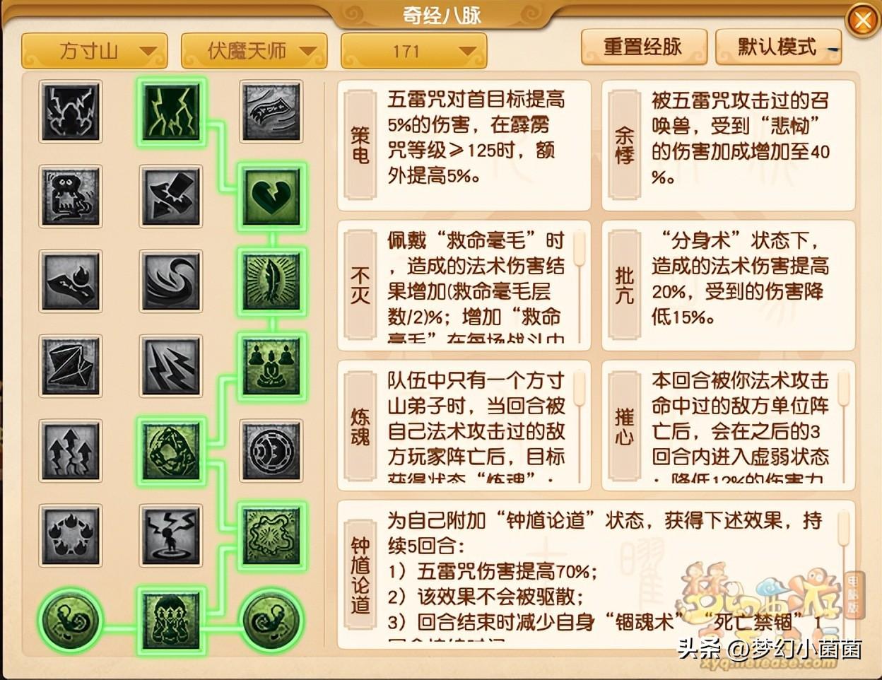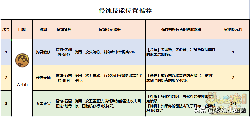方寸山的侵蚀技能效果在我看来都是锦上添花的存在,所以同样推荐用锦上添花的经脉来替代。这里主要说一下五雷正宗流派,如果对愤怒需求不大的,可以选择侵蚀第二排的“符威”,不然则可以考虑侵蚀第5排经脉中的“神机”,不过在普通任务中“神机”效果还是比较不错的,大家根据自身情况酌情考虑即可。