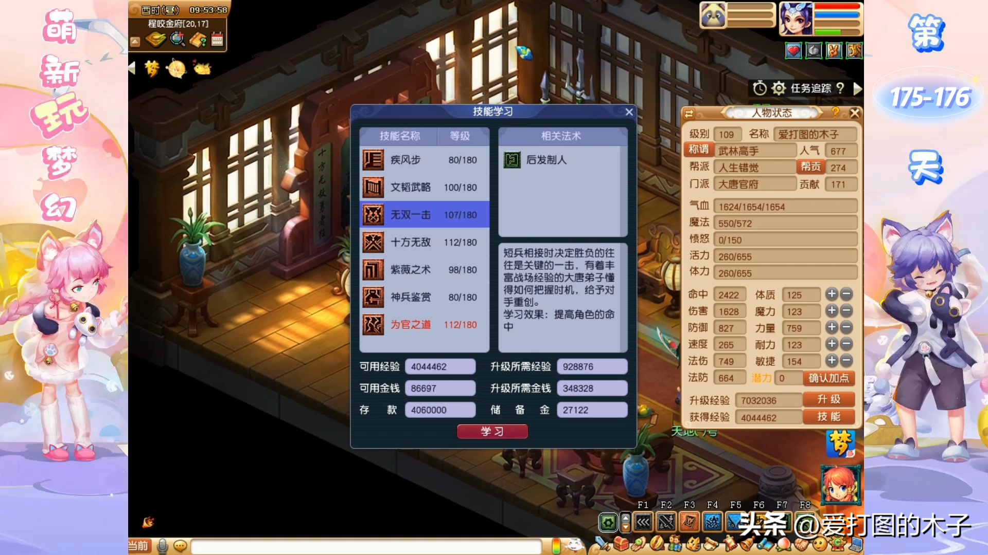 回家打理牧场,发现又够积分换储备金了,花了5000点牧场积分,换了100万两储备金,本来打算回帮派点修炼的,但我看了一下,帮派资材不够,我就回门派升级技能了,把无双一击从96级升到了107级,提升了11点伤害。