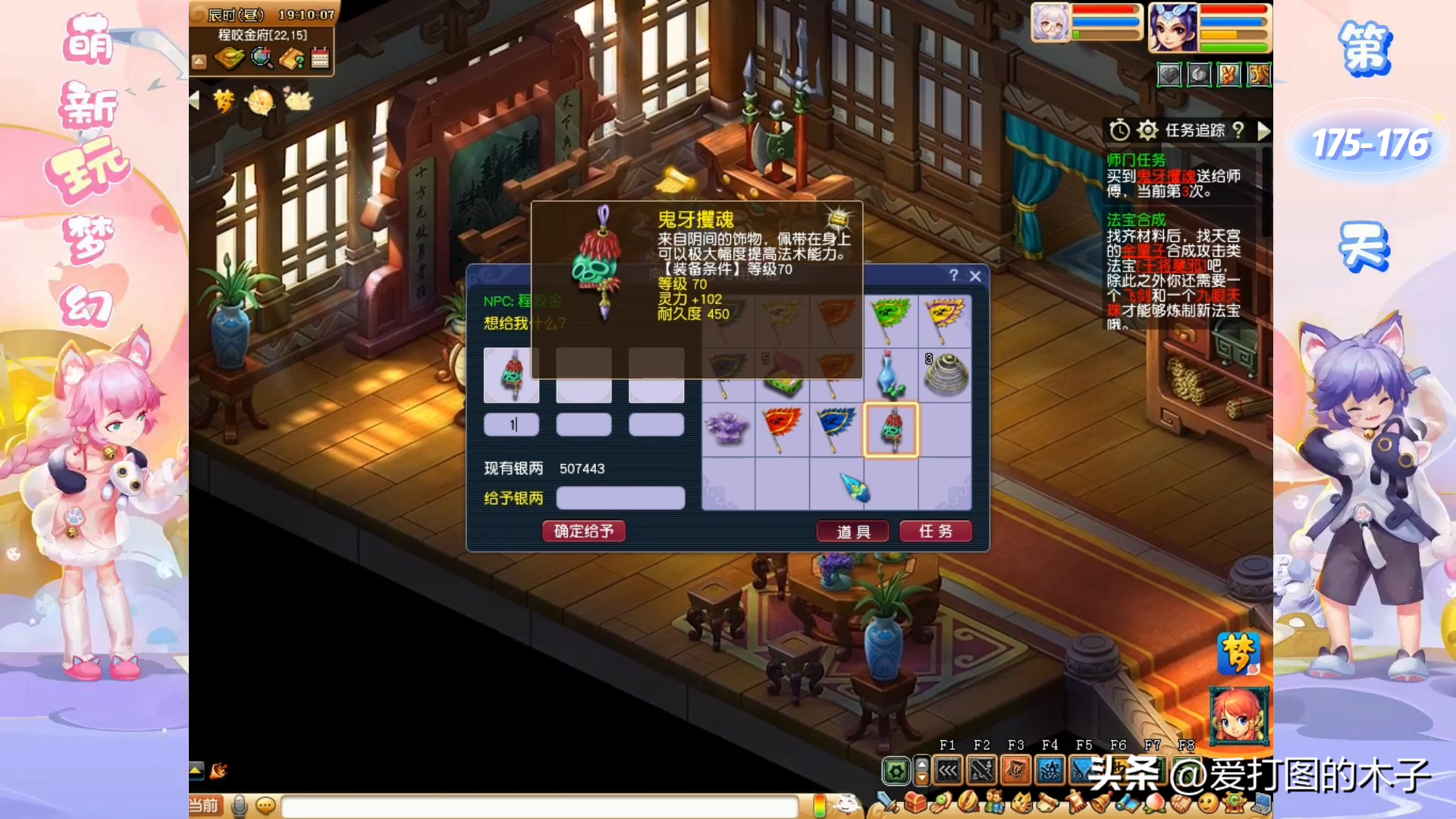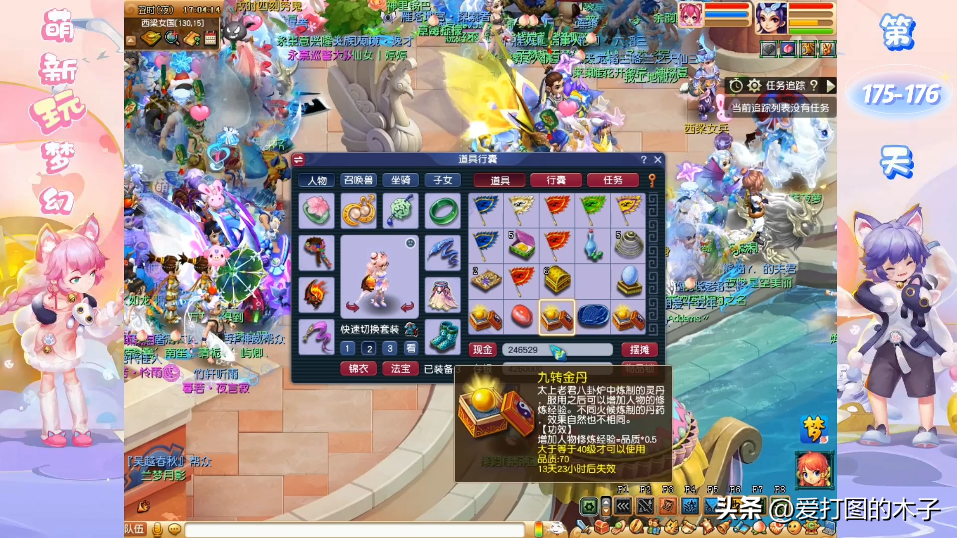 下午的铃铛活动,队友拿到了一颗定魂珠,我可羡慕了,不过想了一下,他是第一次参加铃铛活动,应该是有新手BUFF加持,想想我第一次参加,还拿了一颗夜光珠呢。后来打巧智魔的时候,我也拿到了定魂珠呢,我简直不敢相信,一个队伍能拿俩定魂珠,关键我也没去打大BOSS啊!炼化铃铛,得到了玄武石、红玛瑙、3个九转金丹和3个金银锦盒。至于包裹里的另外3个盒子,是木西小哥哥给我的!