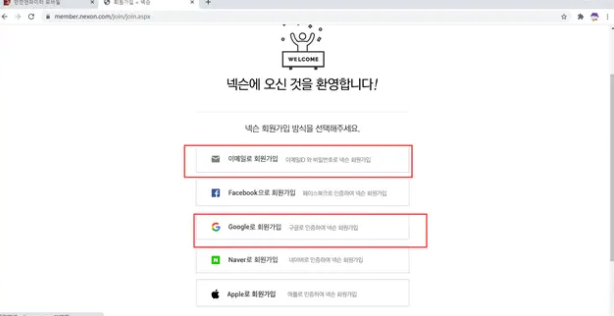 2.我们来注册nexon的账号,点击网站右上角的加入会员,在打开的页面可以选择登陆方式,韩服DNF支持邮箱账号、谷歌、LINE等账号登陆,我们可以选择任意一个登录。