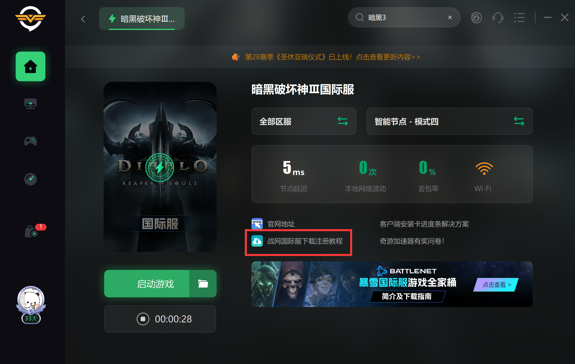暗黑破坏神3国服已经关闭,目前只有国际服可以游玩,玩家们在进入国际服时,需要全程开启加速工具,否则会遇到网络异常,而在奇游加速后即可有效避免网络问题。没有加速时长的玩家们,可以领取之后在加速: