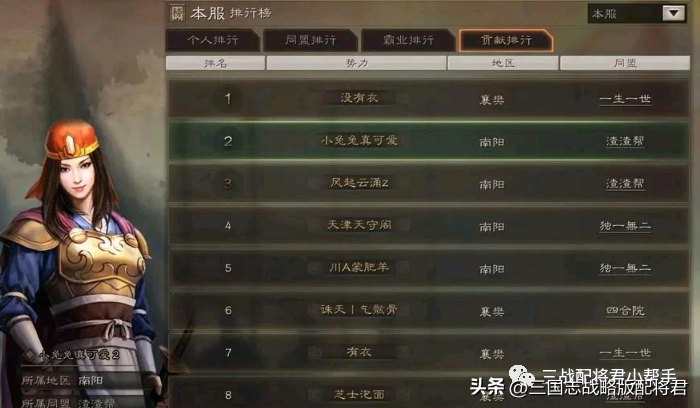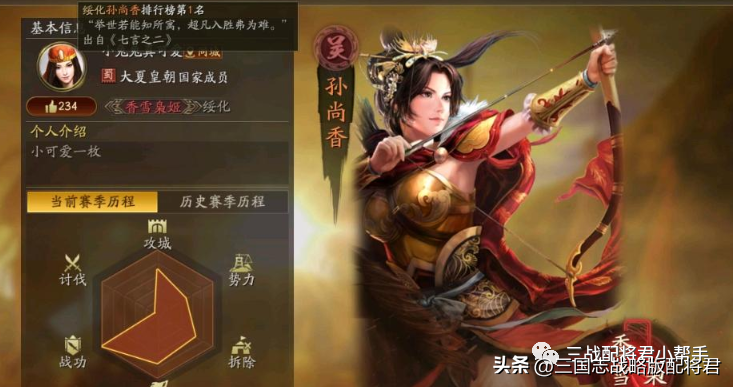 三国志战略版曾经的吴骑可以说横扫战场的一切队伍,为此很多兄弟在S2赛季特地把孙尚香这个武将给抽满了,可是随着环境的变化,吴骑的战场强度已经大不如从前的,很多兄弟辛苦练起来的吴骑打架的表现都很一般,毕竟凌统乱丢BUFF这种情况实在太容易出现了,然后就迷茫了!本期就给兄弟们介绍一套孙尚香T0级别的黑科技,已经成功杀入全区贡献榜第一名!