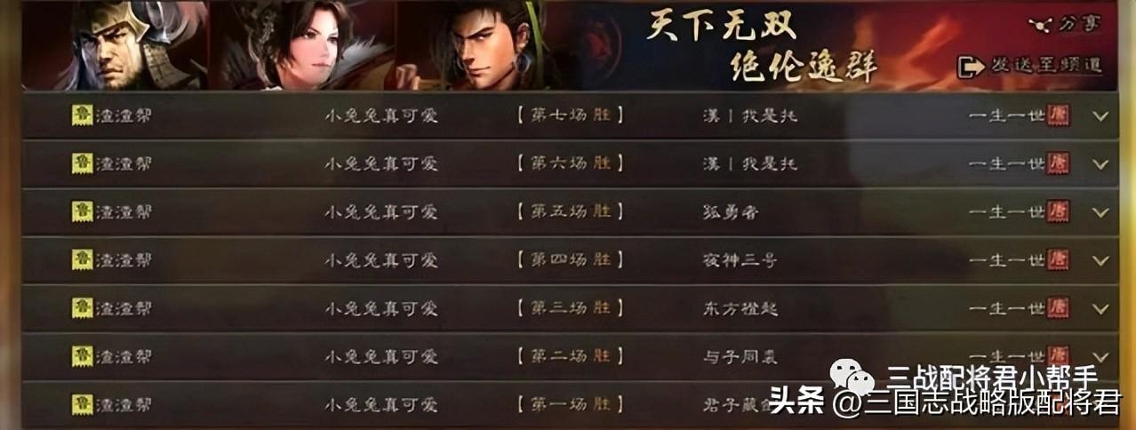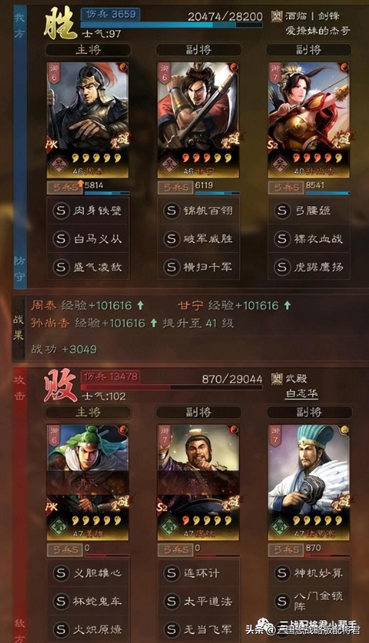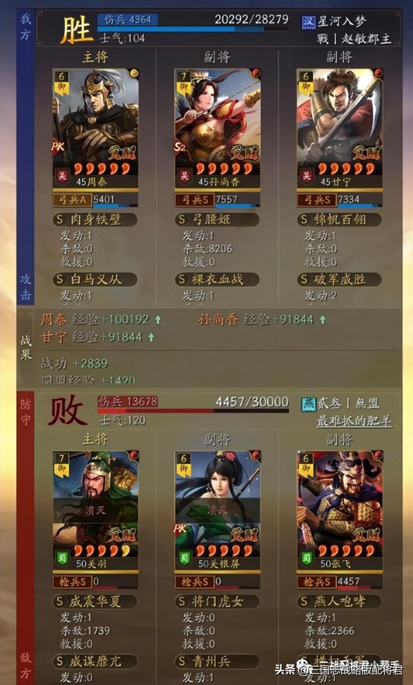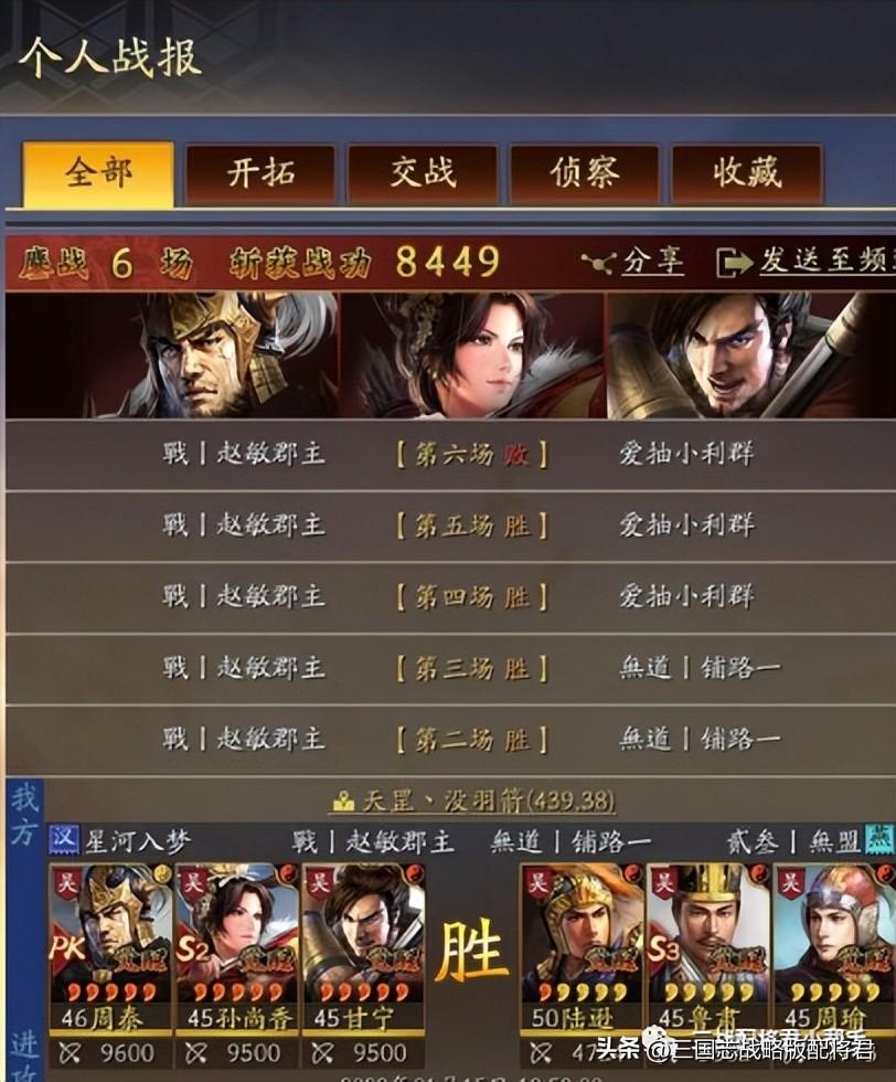 总结:这个队伍在前期渊骑特别多的情况下,用起来是真的舒服,带了箕形阵基本上都是低损吃下的那种,白马配合横扫和卧薪尝胆在控制上也比较给力,虽然没有带破军威胜的爆发高,可伤害也足够用了!总体来说就是一套针对环境而出现的新配置,主要打的肯定还是渊骑和三势吕了,同时队伍也有着不错的控制,如果对手渊骑三势吕较少的话,那么箕形阵可以换成其他战法!