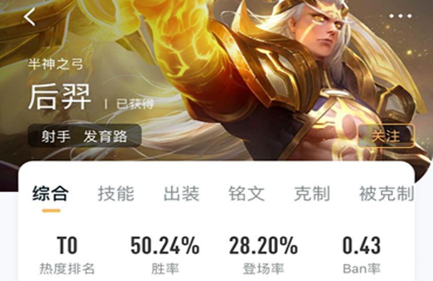 他的胜率遥遥领先其他射手,保持在50.24%,目前还是T0热度。玩后羿掌握好技巧之后,不仅能够高强度的持续输出,到后期还有机会获得“打不死小强”的称号。