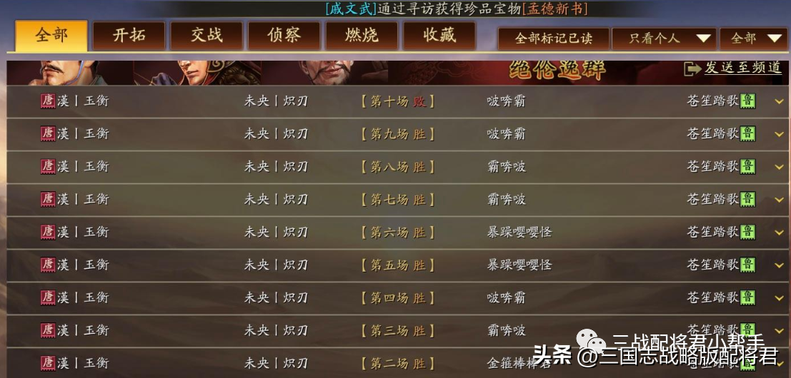 总结:对于大多数玩家来说,单纯靠半价和免费抽卡,每个赛季可以提升的空间还是比较有限的,除非运气特别好连着出关键性的核心武将或者自己需要的核心输出武将,否则的话建议还是多打一些装备来提升自身的实力,最常见的就是暂避援助体系了,还有一些2-3灵动的情况下,可以让很多队伍的强度都上一个档次!之前有说过满红大佬的群弓就是三灵动的,出门经常就是各种一万五甚至更高的战功,如果一个灵动都没的话,正常下来出门打一波也就七八千战功,足足差了一倍的战功之多!考虑入坑的兄弟,也需要多注意援助甲,灵动这类核心的宝物,都是可以给队伍加分的!