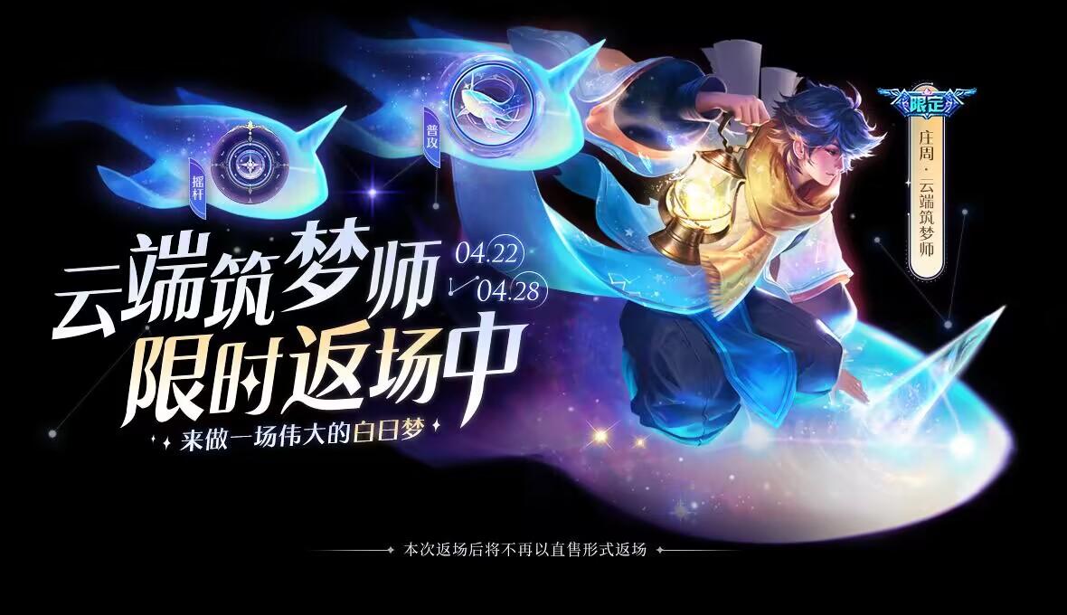 此外,正式服内又有一款限定皮肤返场,庄周的云端筑梦师将在4月22日正式上架游戏内,售价888点券,同时该皮肤已在今日于鹅毛市集和游市集提前售卖。