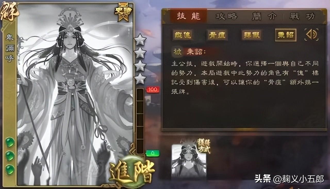 【秉诏】:主公技,游戏开始,你选择一个与自己不同的势力,本局游戏中此势力的角色有“傀”标记受到伤害后,可以让你的“骨疽”额外摸一张牌。