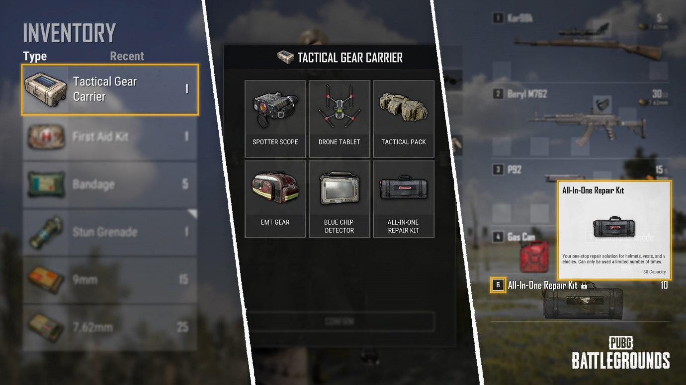 今后在比赛开始时,所有玩家的物品栏中都会出现一个战术装备箱。为了确保战术装备箱不会在跳伞后对游戏前期的游玩造成负担,它的重量设为了 0。