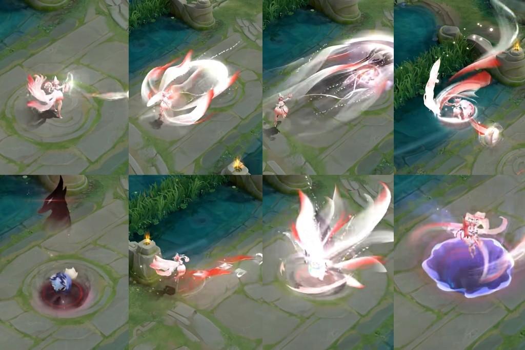 这次的技能特效也是比较飘逸的感觉,采用的是红白淡色相间的颜色搭配,整体围绕狐尾元素设计,特效有点云雾缭绕的感觉。