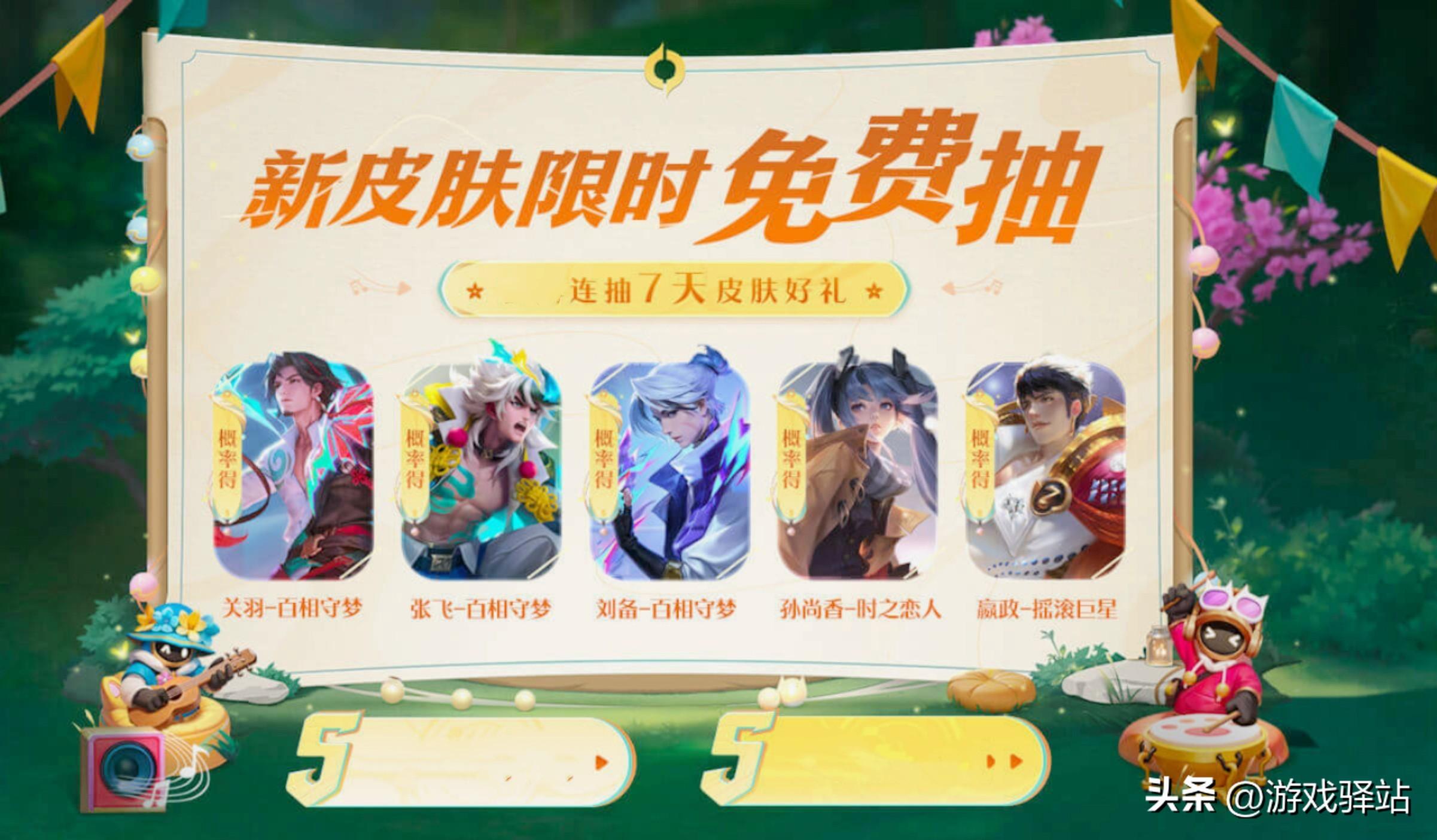 最后官方开启了新皮肤限时免费获取的福利,玩家完成任务一共有七次机会得到永久勇者/史诗/传说奖励,包含了刘关张“百相守梦”、莱西奥西部游侠、孙尚香时之恋人和嬴政摇滚巨星等皮肤。