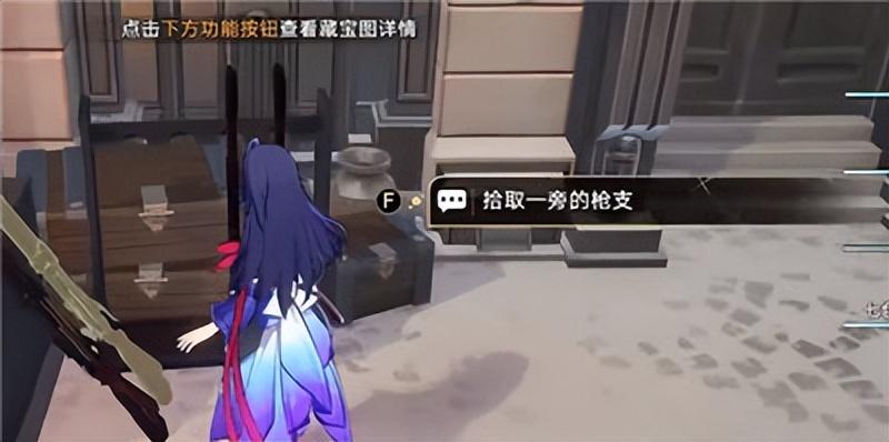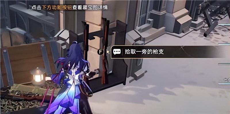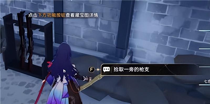 3、根据故事书线索,将散落的武器归位:我们来到下图位置,拾取一把武器;