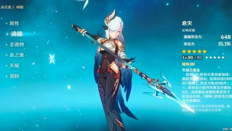 首先,申鹤五星武器首选熄灾,满级属性攻击力741,超高白值,副属性和特效均完美契合申鹤,缺点是圣遗物可能需要堆点充能才能保证大招的循环。如果想要大招循环快些,可以用薙草之稻光,配合宗室4件套使用起来感觉非常不错,开大之后还有3300的攻击力同时顾及充能和攻击力,完美契合4宗申鹤。此外,和璞鸢和天空薄荷也是不错的选择,他们都有高额的白值,特效也提供一点攻击力,入手难度较其他五星枪低,只是副属性和特效用处小。此外,申鹤在永冻队里最好拥有1命,来提升充能和增伤弹性。