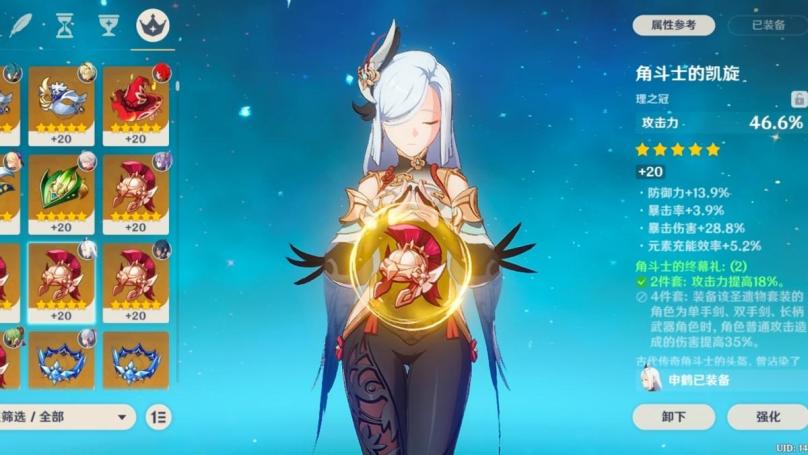 然后是圣遗物部分,申鹤如果作为副C打伤害的话,最佳选择是追忆角斗2+2,这套圣遗物是将冰翎增伤最大化的套装。纯辅助可以选择4宗室,开大后的全队增伤20%也能替冰翎增加伤害,但由于宗室4件套效果不能叠加,如果队伍中有其他4宗室的话就不推荐这套。