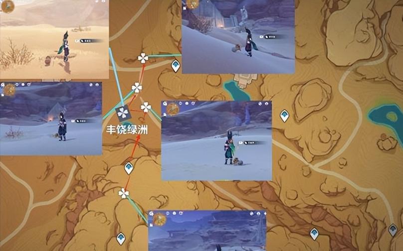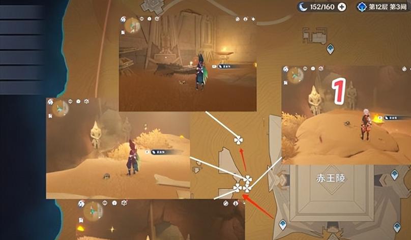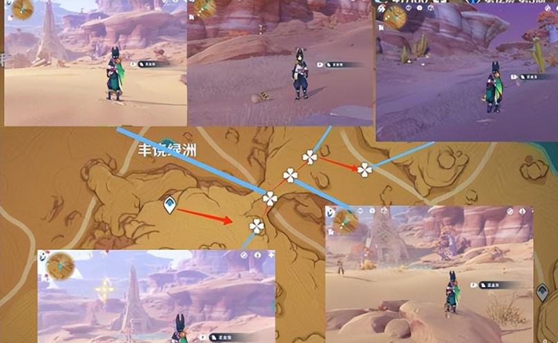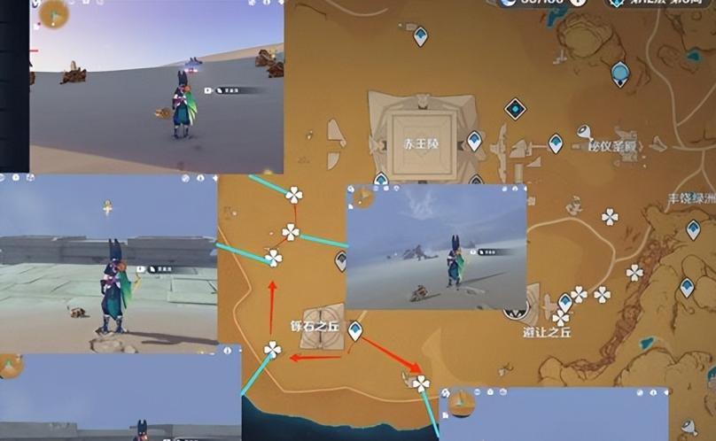 1号标记图处圣金虫在沙堆里,需要用到风元素角色,将沙堆吹走后便会出现圣金虫;