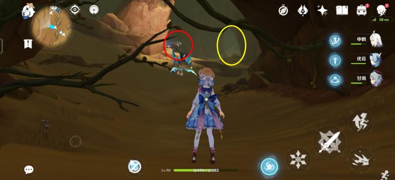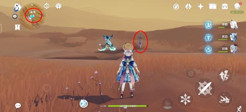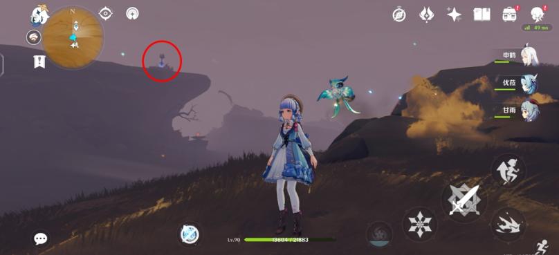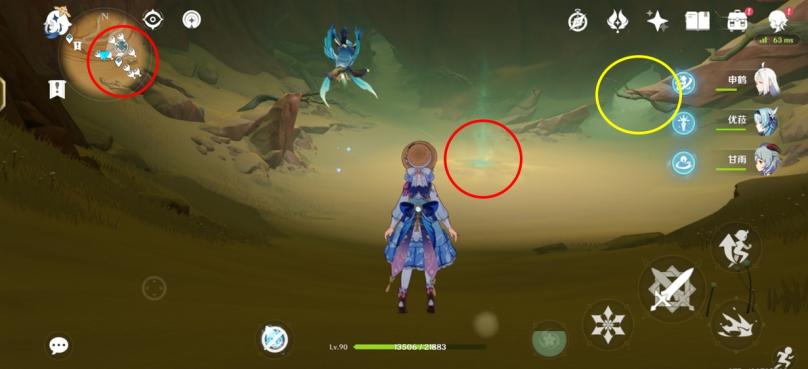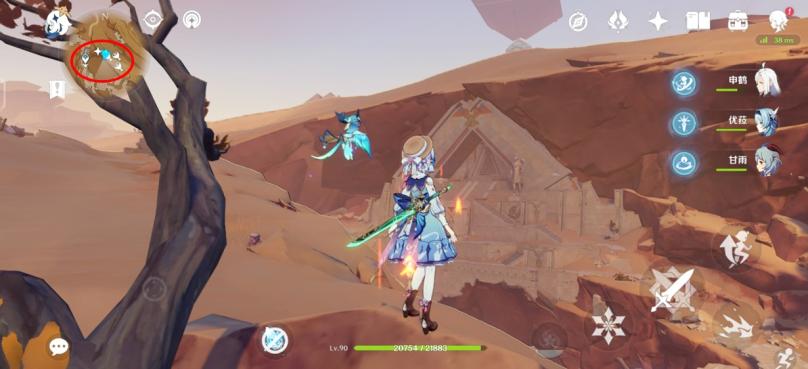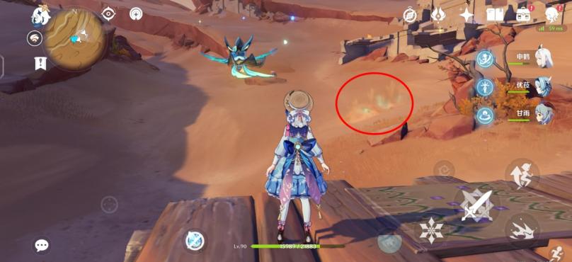 图四:来到3号传送点,向正东方向跑,来到火腿标记大致位置,可以看到一座遗迹、一个怪物守护的宝箱平台(绫华脚下就是),红圈里冒绿光的就是守护沙脂蛹的沙虫。
