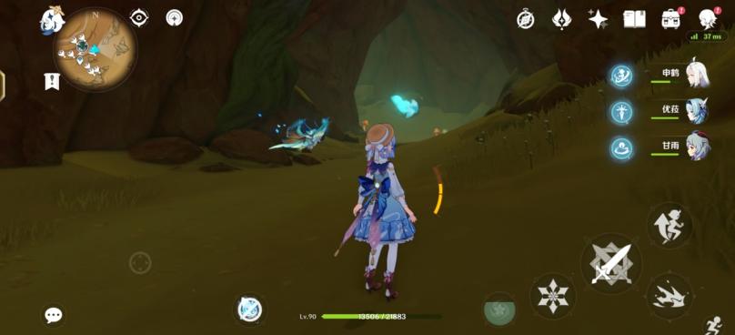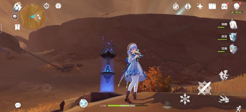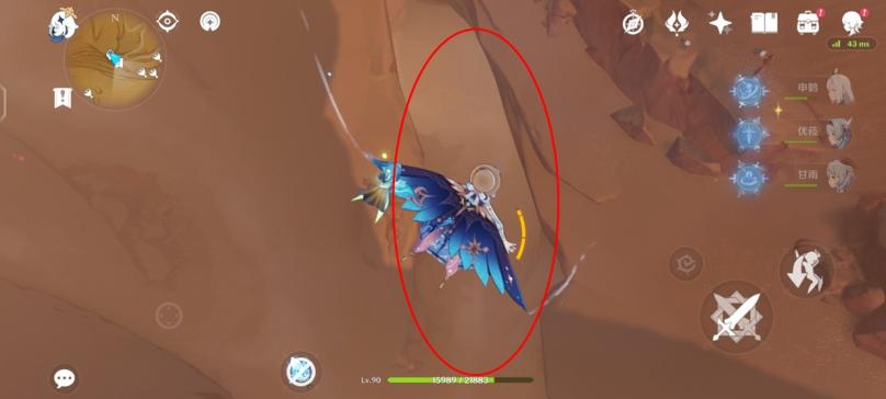 图十二:来到5号传送点,飞向正前方的沙地,低头还能看到两个遗迹机兵在巡逻。图中绫华脚下是沙虫发动袭击的前兆(帖主截图是总是被遗迹机兵打,一气之下把大招都甩了)