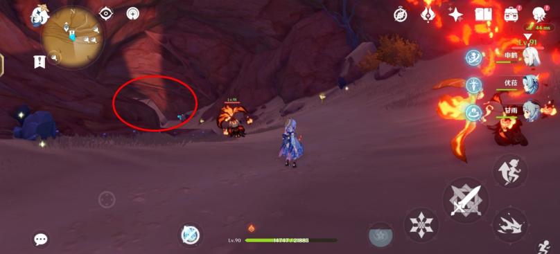 图六:一直在裂谷里向前走,来到突破需要打的BOSS的洞口(红圈),守门的是两个火骗骗花。