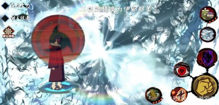 利用写轮眼的幻术,幻化成,成群乌鸦来回穿插攻击敌人。攻击动作记录三次后敌人会中术伊邪那美。【可空中释放。在幻术有效时间内,长按技能本体可以与任何分身交换位置,攻击敌人或被敌人攻击时都能记录动作(普攻也能记录动作)。敌人中术伊邪那美后,行走受限,视力降低,并持续一段时间。】