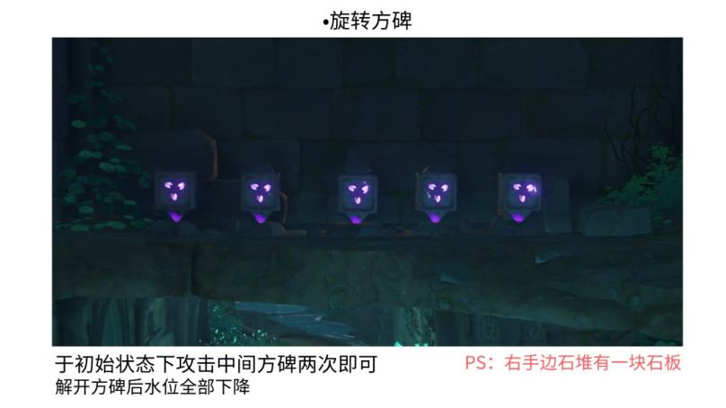 4.进入裂洞后左转游至尽头,从阶梯处上岸5.对面有五个旋转方碑,解开后水位退去