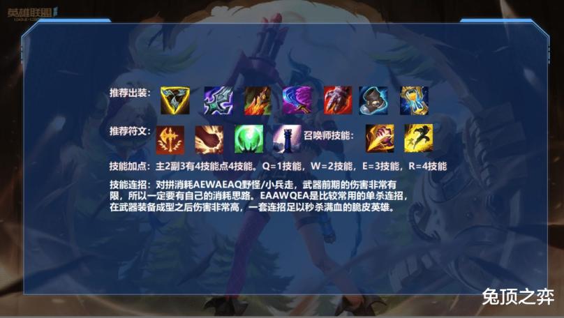 对拼消耗AEWAEAQ野怪/小兵走,武器前期的伤害非常有限,所以一定要有自己的消耗思路。EAAWQEA是比较常用的单杀连招,在武器装备成型之后伤害非常高,一套连招足以秒杀满血的脆皮英雄。