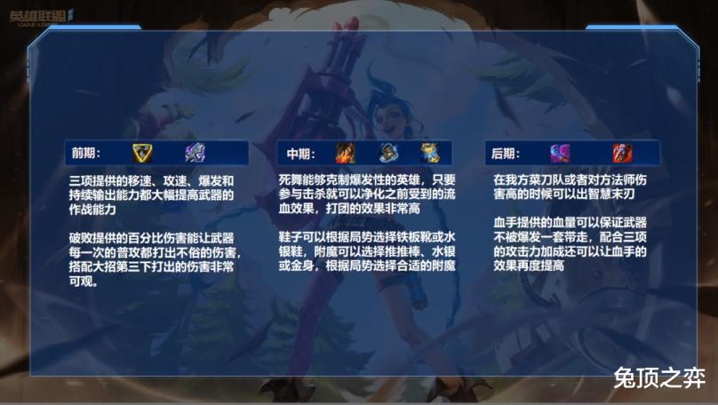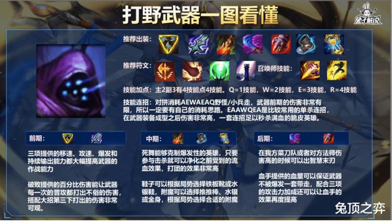这个版本三项流出装无疑是武器最强的一套出装了,这套出装很契合武器的单带能力,切C位能力和团战的坦度,中期的发育思路一定要明确,不要去打没有意义的团战,在三件套后可以选择跟队友去打团,打团时一定要找到对方后排C位并且给到足够的压力,在两件套时去单带去最好的选择,当四件套及以后时,武器最好是打团,这时候的武器打团是非常恐怖的,能瞬间融化对方后排。