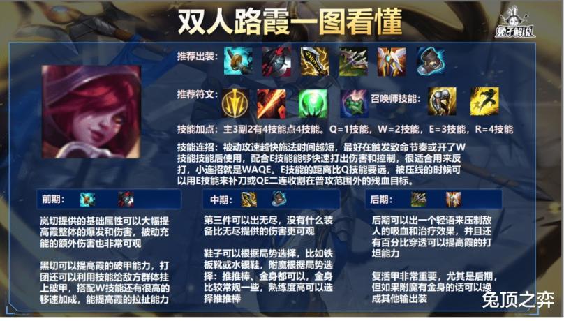 武器的发力期偏后期,所以在中期运营的时候一定要找到适合自己的发育节奏,尤其是三项破败这个时间线,武器打团很容易被集火秒杀,所以这时最好去单带发育,单排的时候利用兵线推进时间去做好野区的视野,避免被敌人GANK。