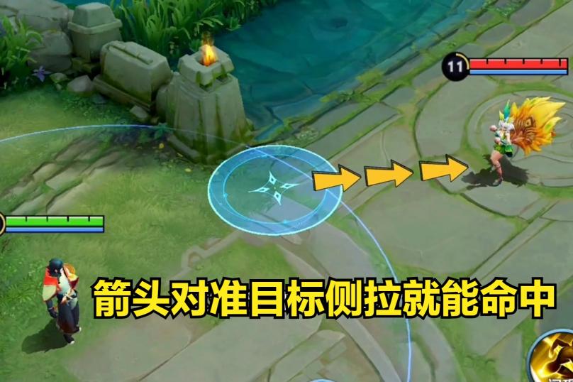 不过很多小伙伴进场是空技能的,其实这里有一个小技巧,就是侧拉,当你释放三技能时,指示器上有4个小箭头,当箭头瞄准线敌人时,三技能是100%命中的。这个技巧可以用来消耗线上的敌人或者是防止对面残血逃跑时使用。