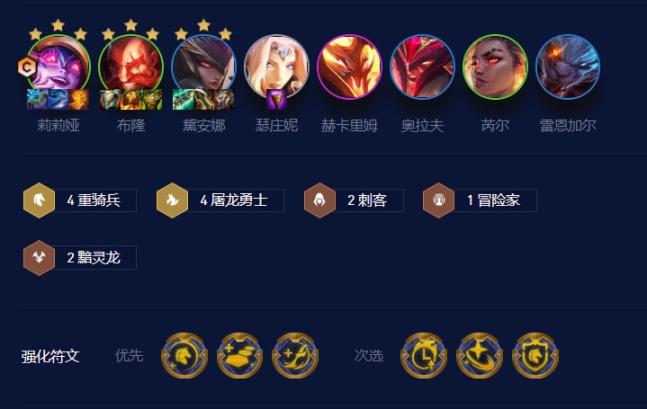 重骑莉莉娅这套阵容组成十分的简单,猪妹 莉莉娅 芮尔加上人马组成四重骑,给前排英雄提供不俗的双抗,同时提升莉莉娅这个主力输出的肉度。莉莉娅作为主C肯定要搭配上四屠龙勇士,分别是布隆 奥拉夫和皎月,布隆携带狂徒加上其他的防御装站在阵容前排,承当主力前排,虽然没给布隆搭配护卫羁绊,但这个英雄本身的肉度就远高于其他英雄。D莉莉娅的时候可以顺便把布隆D到3星,会得到意想不到的效果。