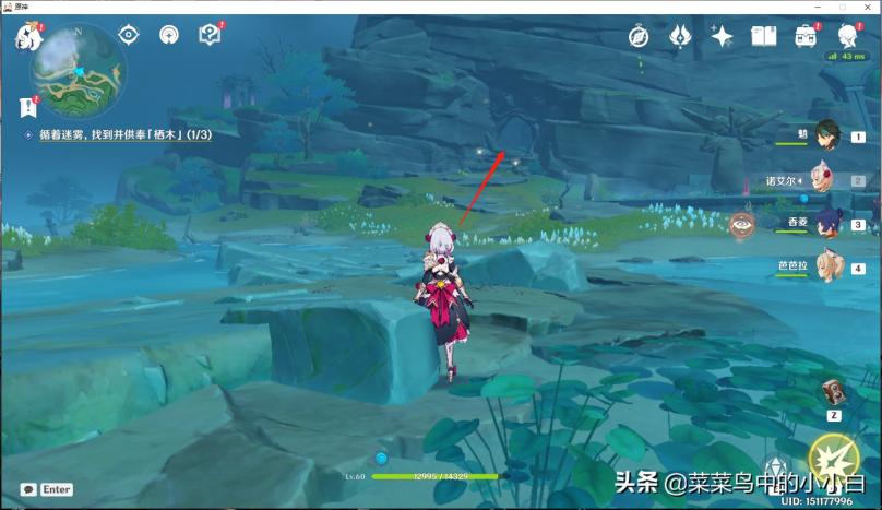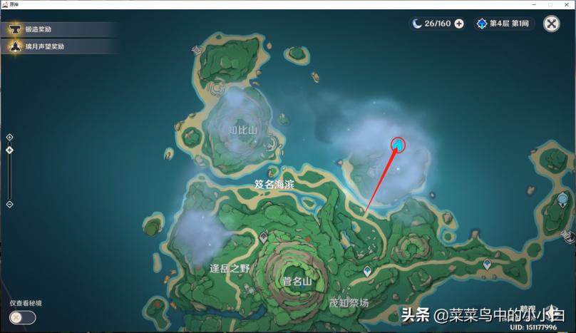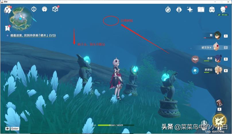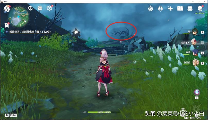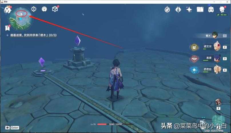 打开地图可以看到3个雾蒙蒙的地方,就是你要去供奉栖木的位置。首先,我去的是“千来神祠”,这其实比较简单,主要是大家要找到2个小孩(阿瑠)的位置,如下图标记的地方(个人小地图自动显示“雷瞳”的位置,我在这里绕了好久,进去看不清,不是掉坑里,就是掉水里,还有被怪物追着打…… )