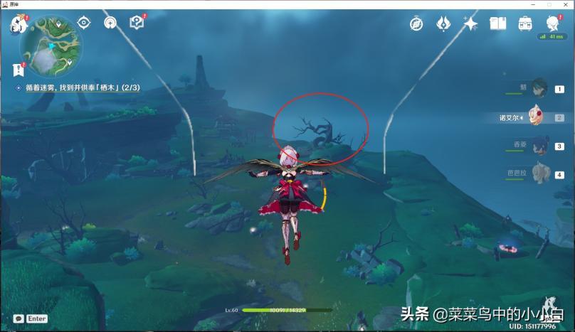 第三处迷雾,建议先将知比山的传送激活(在山顶上),然后直接从传送点直线飞行(在空中貌似受迷雾影响较小),然后快到时,可以看到一棵歪脖子树(栖木),如下图位置,这样大家进去就可以直接找到阿瑠,对话接任务。