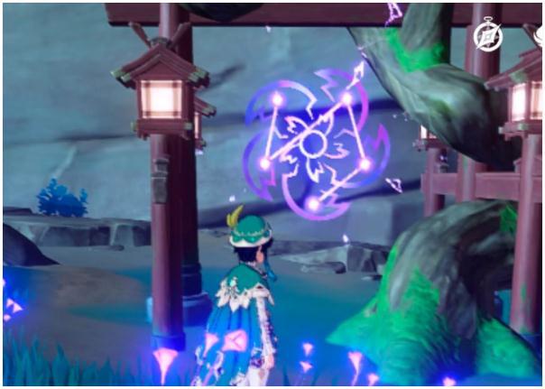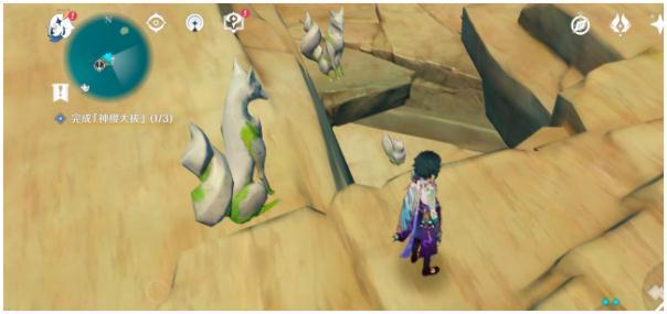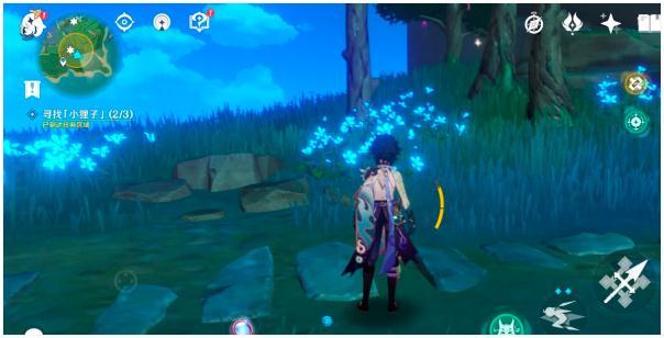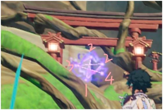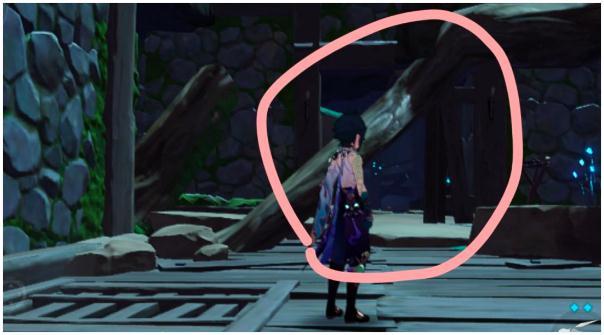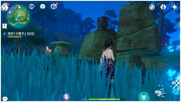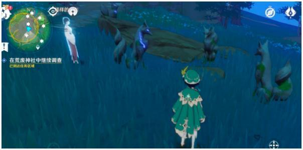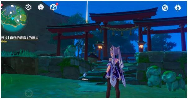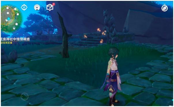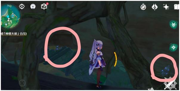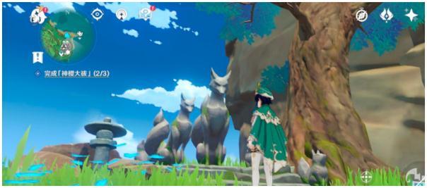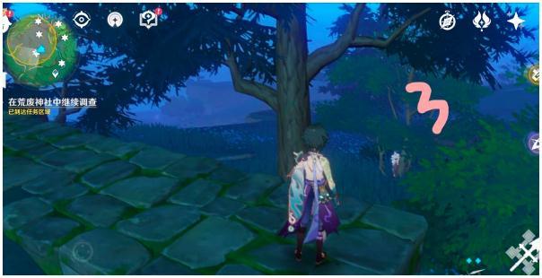 19.最后是神里家附近,北一点的地方有一颗巨大的树根,附近如下图,同样照小狐狸,出现大狐狸,电它,出现镇物