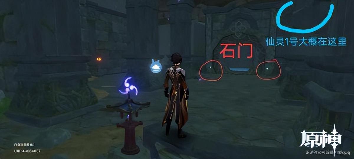 右边有一道石门需要跟随两个仙灵才能打开,如图: