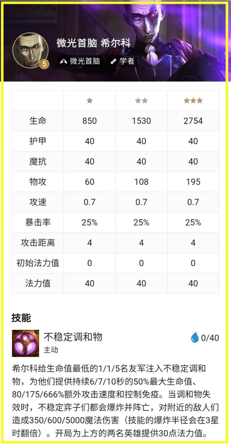 其实将buff给到生命值最低的敌人这一设定,就决定了希尔科的核心作用是为阵容提升前排坦度,因为常规阵容基本都是前排英雄先被集火吃到伤害,它们能够站住脚跟为后排拖延输出时间,是至关重要的。