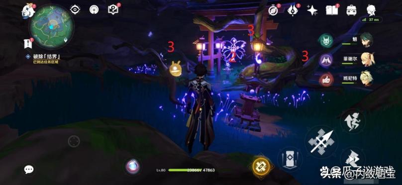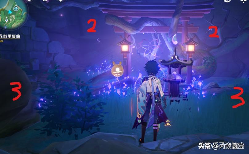 与谜样的人影对话(两次)向地图东北方,神社屋顶上;地图南方,狐狸像前;西南方,树下。全部对话完,得到三个宝箱