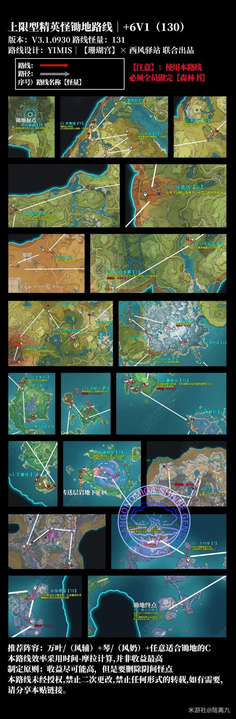 路线基本参数:路线名称:精英怪+6V1(130)怪物数量:131预计耗时:30min摩拉收益:5.5w狗粮平均:13个(蓝+紫)
