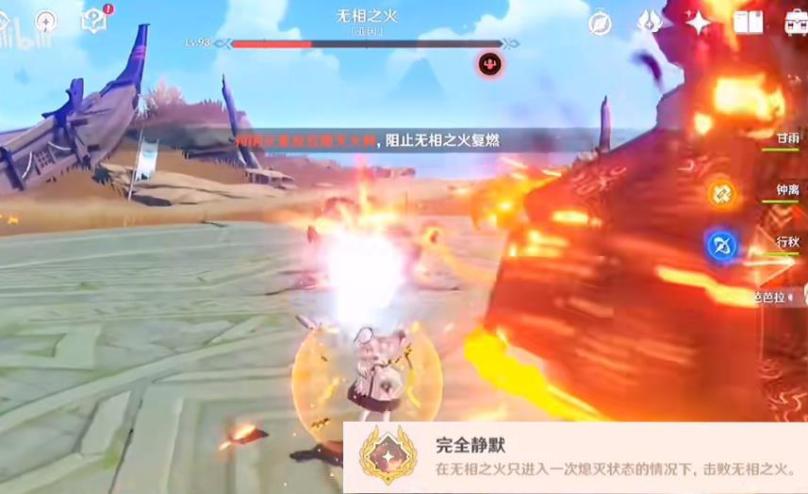 3.火出现三个供血设置,利用水系角色快速打掉三个黄石,之后击败,即可获得「完全静默」