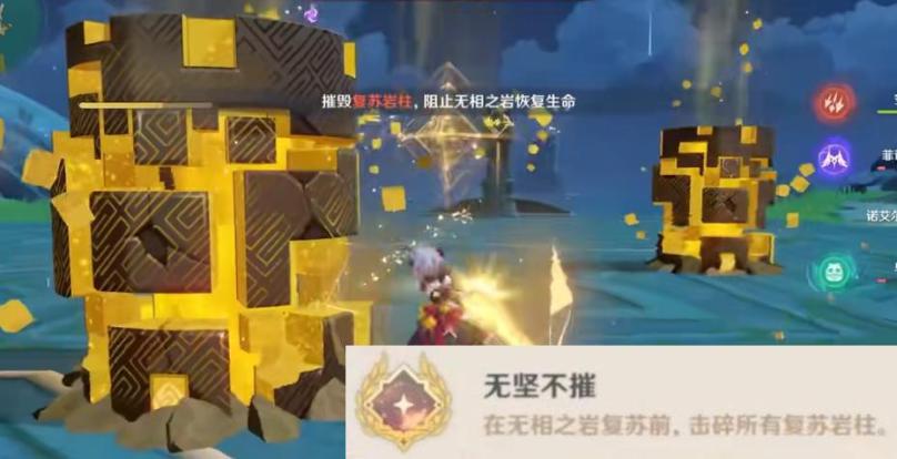 3.当无相之岩残血时会生成3个岩柱,击碎三个柱子。即可获得「无坚不摧 」建议使用大剑角色或是钟离