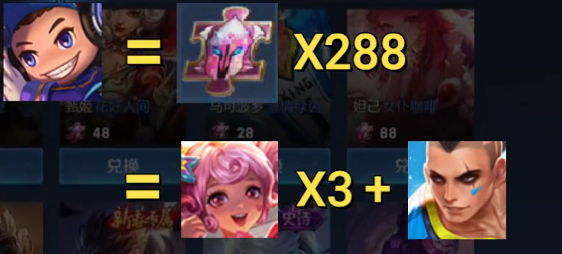 一个电玩小子=288个皮肤碎片,用同样的碎片数,我们可以差不多换到3款88碎片的史诗皮肤加一个伴生皮。