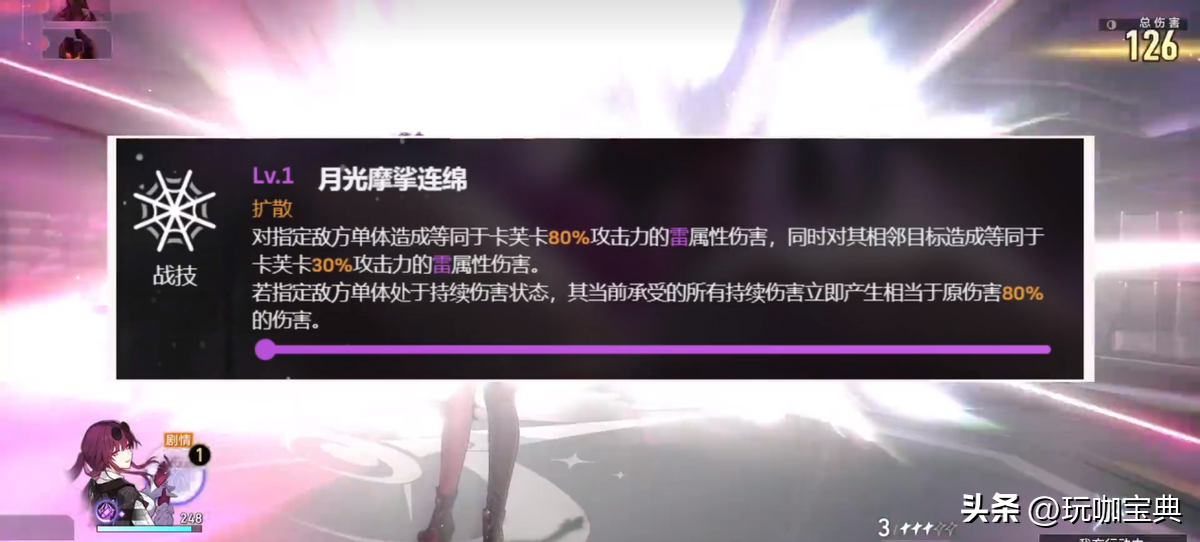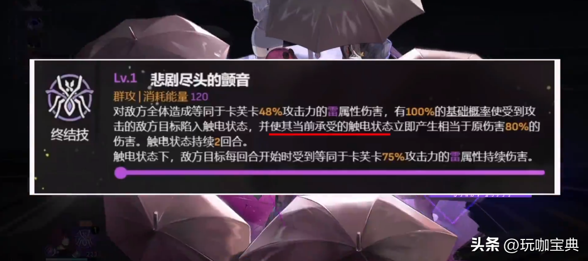 卡芙卡最为核心的技能。机制是当释放战技时,会将敌方身上所有的持续伤害提前引爆,造成原本伤害的80%,同时不会影响持续伤害的时间和效果,也就是说当回合结束后,持续伤害会正常结算,也就是说这个怪物相当于受到了接近两次的持续伤害。