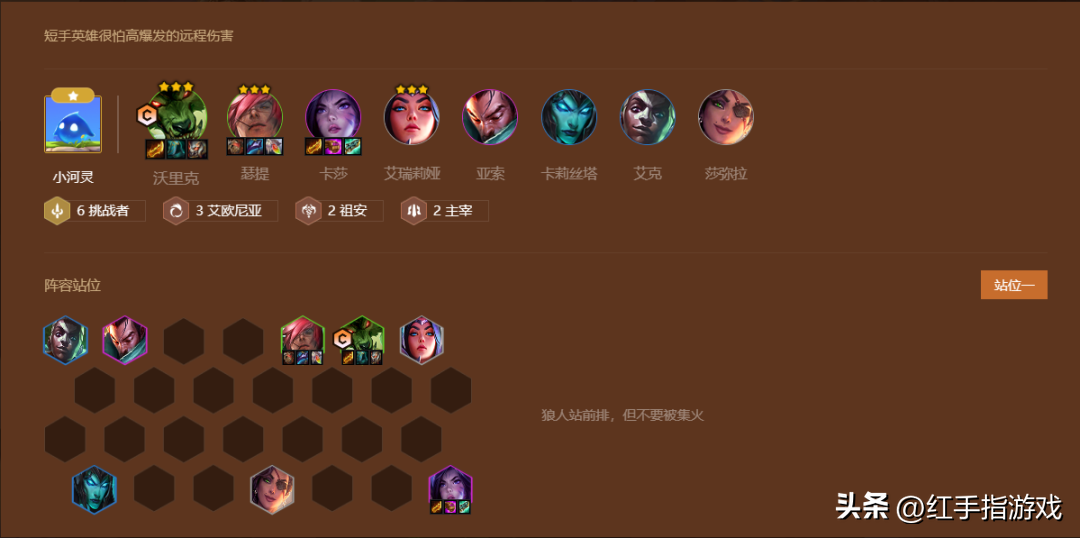 (1)6人口波比、提莫、加里奥、乌鸦、克烈、娑娜组成3约德尔人3德玛西亚2司令2术士的基础阵容。