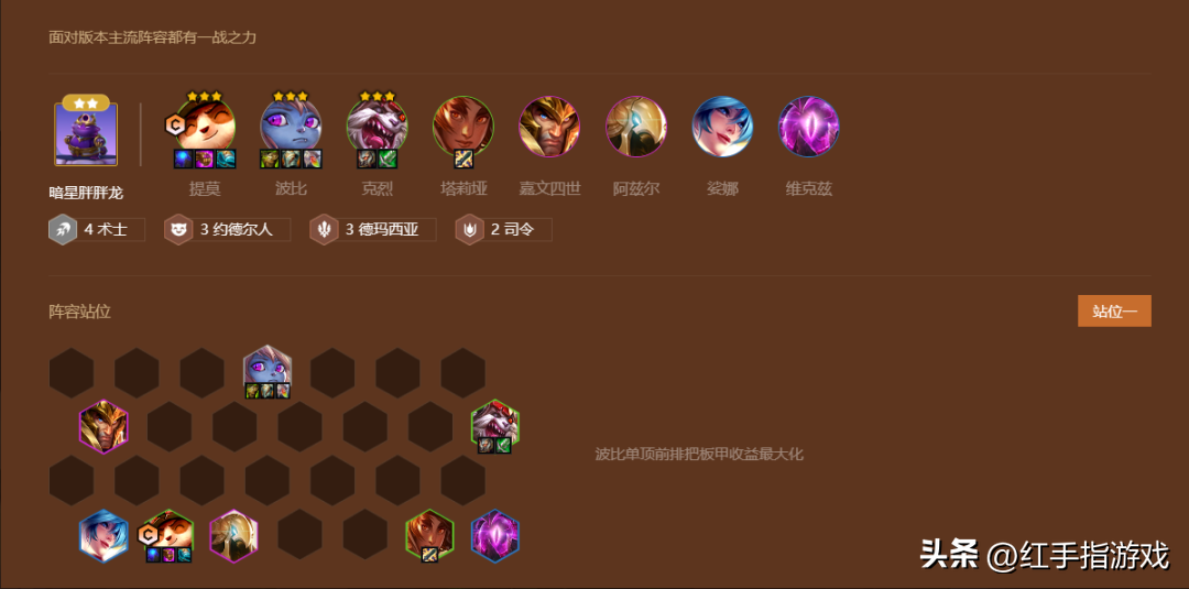 (4)阵容解读:目前测试服最强势无脑的赌狗,成型基本前2!开服上分首选阵容。阵容需要在6级D提莫3星以及两个以上3星(最好是加里奥和乌鸦),让提莫变成4星。3-2拉6启动D牌,中期全员2星就有不错的锁血能力,但是最晚要在5-1之前D出了3星提莫、3星加里奥、3星乌鸦。