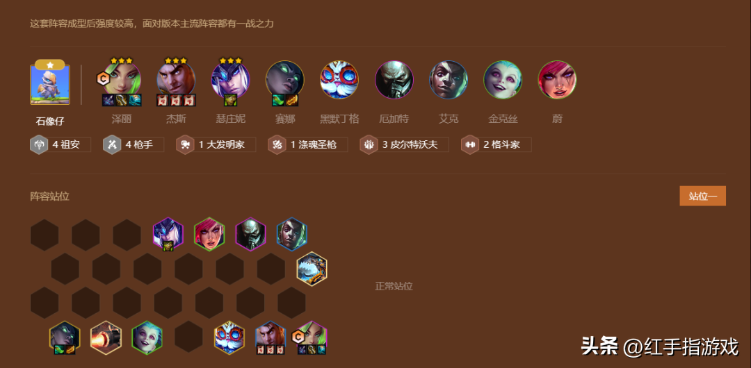 阵容核心是围绕3皮城2枪手2格斗2祖安搭建阵容,核心打工仔是金克丝+基克的先驱。优先推荐开局有3皮城开始养龙玩这套阵容。