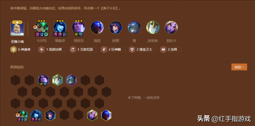 (4)阵容解读:6神谕全员永动机,但是前排会比较薄弱,需要塔里克、卡尔玛追三,难度较大。成型了比较有实力但是会弱于提莫术士和裁决潜行劫,2星中期有点难锁血,天胡开可以玩。正常3-2拉6启动将基础牌D2两后,上7在慢D3星卡尔玛、塔里克、冰女以及2星慎,最晚要在5-1追出来3星卡尔玛、塔里克,否则很难吃到分。