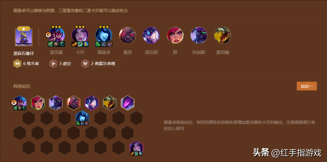 (4)阵容解读:阵容挖掘机+卡莎双C,挖掘机技能单体爆发高且有真伤效果,搭配高斗士又肉又有输出,卡莎负责打AOE配合挖掘机清场。如果有斗转可以给丽桑卓,7级就可以开6斗。阵容运营方式有点类似于S8的至高天青钢影,都是3-2拉6启动将基础牌D2星后,上7在慢D挖掘机3星以及猪妹和卡莎。如果是在6级慢D雷克赛3星可能会因为雷克赛的清场速度慢而锁不住血,除非数量多,不然阿北还是建议上7在追3星。